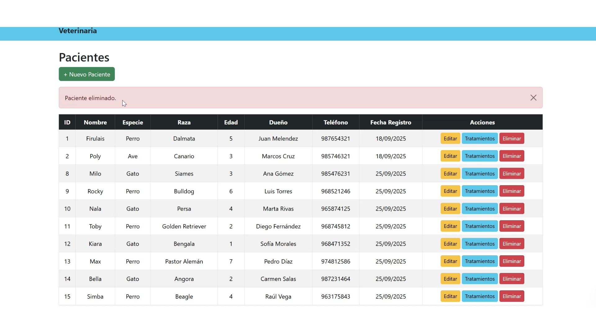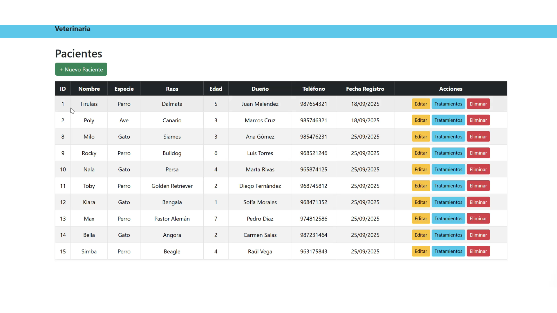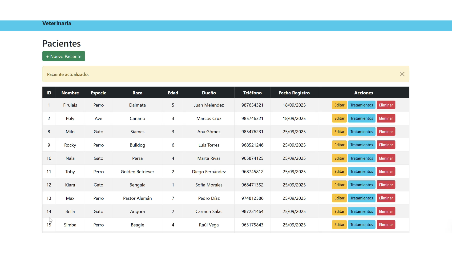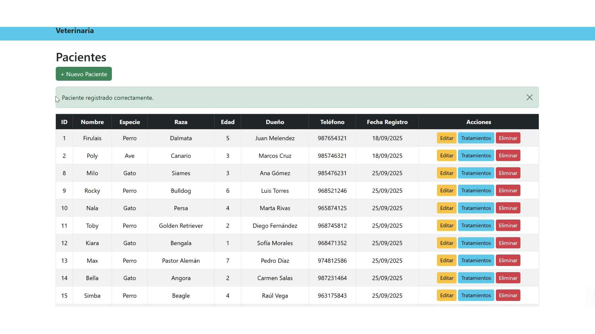 Desarrollé un sistema web de gestión para una veterinaria, creando una plataforma responsive y eficiente para administrar pacientes y sus tratamientos de forma organizada. Implementé un módulo CRUD completo para el registro, actualización, eliminación y consulta de pacientes, así como la gestión detallada de los tratamientos asociados mediante tablas relacionadas en la base de datos, garantizando integridad y coherencia de la información. Diseñé una interfaz intuitiva que facilita el seguimiento del historial clínico, la visualización estructurada de datos y la actualización en tiempo real. Este proyecto integró desarrollo full-stack, modelado relacional de base de datos, diseño UX/UI y optimización de rendimiento, aportando una solución escalable que mejora la gestión clínica y el control de la información médica.