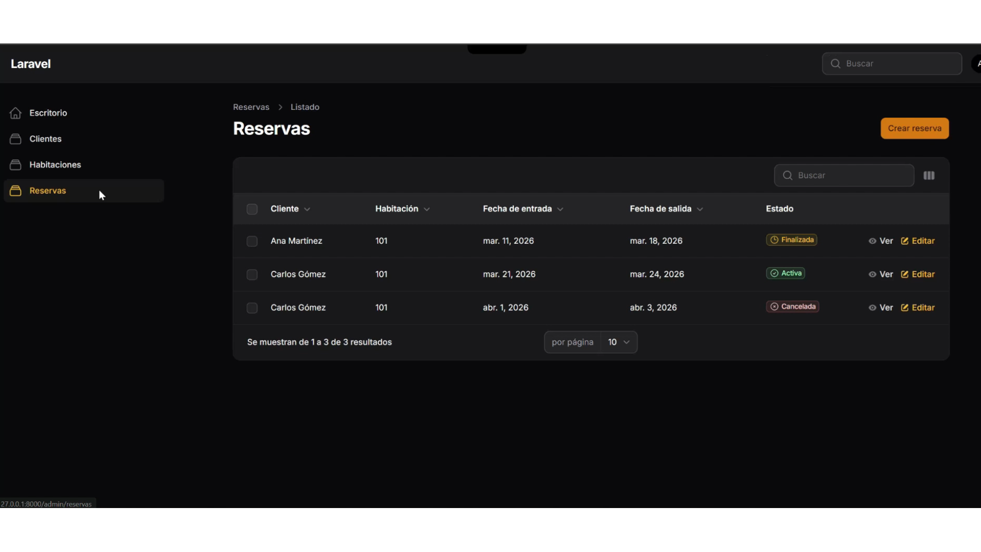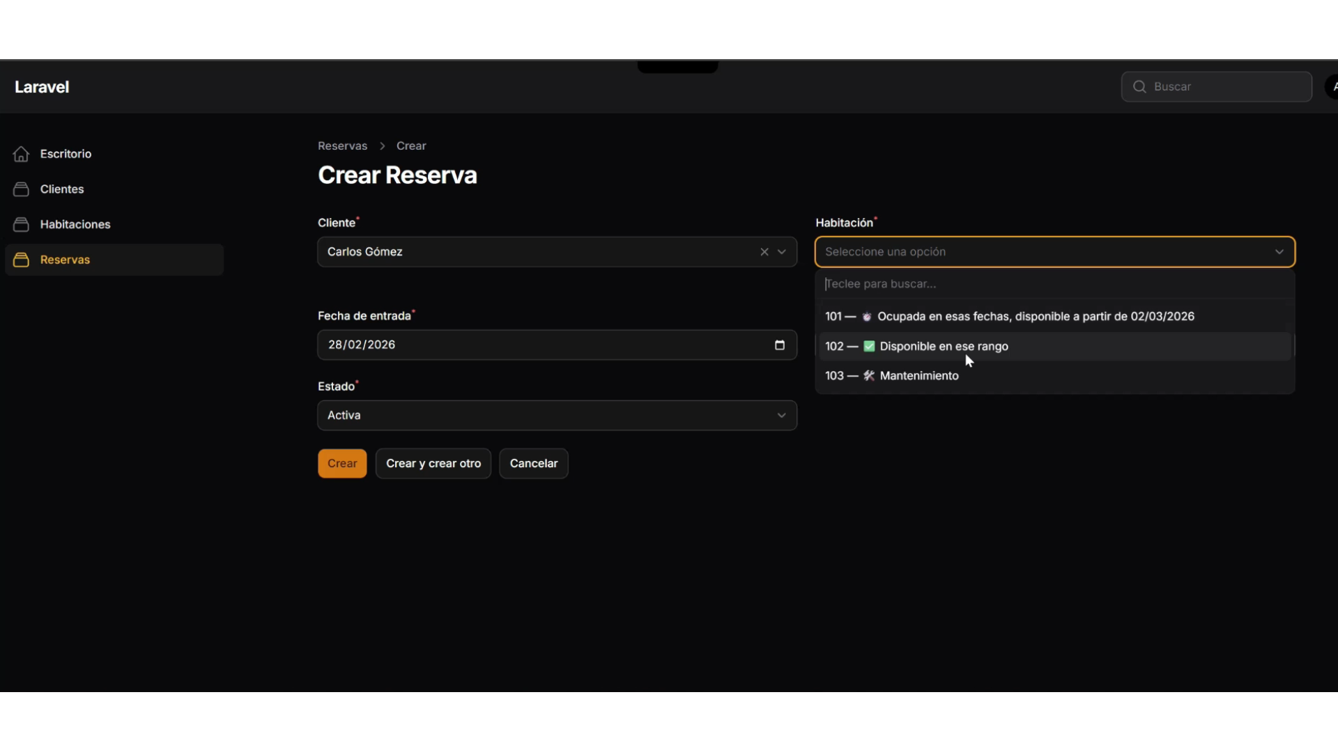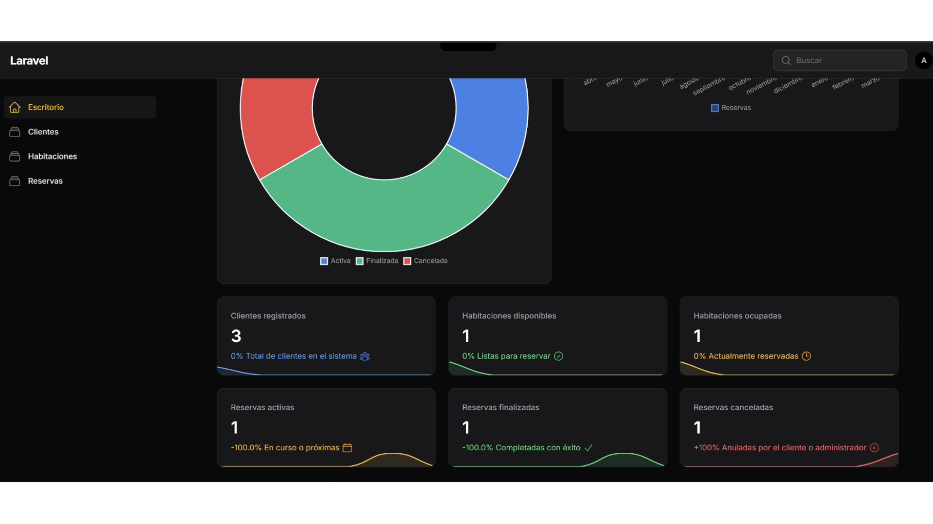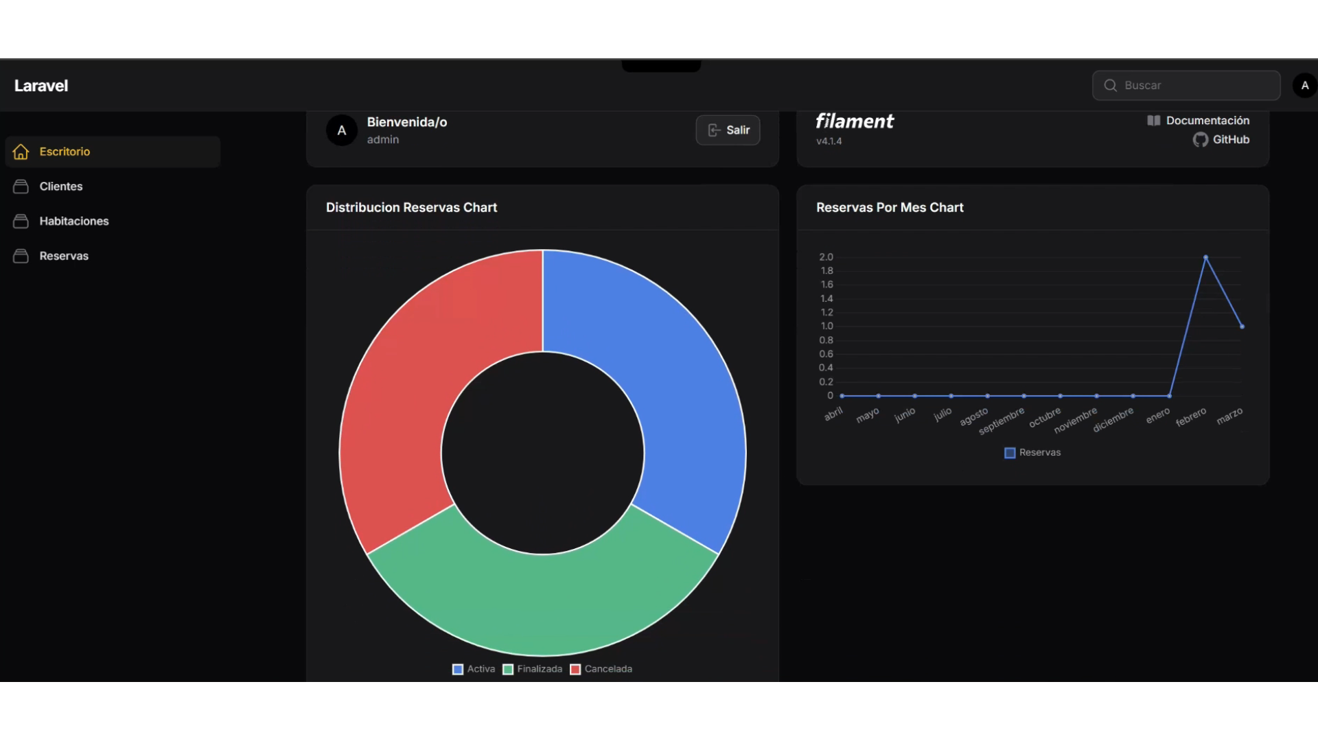 Desarrollé un sistema web de gestión de reservas hoteleras con Laravel y Filament, implementando CRUD de clientes, habitaciones y reservas con tablas relacionadas para asegurar integridad de datos. Incorporé autenticación con Filament y un dashboard con métricas en tiempo real, incluyendo gráfico tipo dona para el estado de reservas, gráfico lineal comparativo mensual y paneles con indicadores clave (clientes, habitaciones disponibles y ocupadas, reservas activas, canceladas y finalizadas). Integré desarrollo full-stack, modelado relacional y visualización de datos en una solución eficiente y escalable orientada a la toma de decisiones.