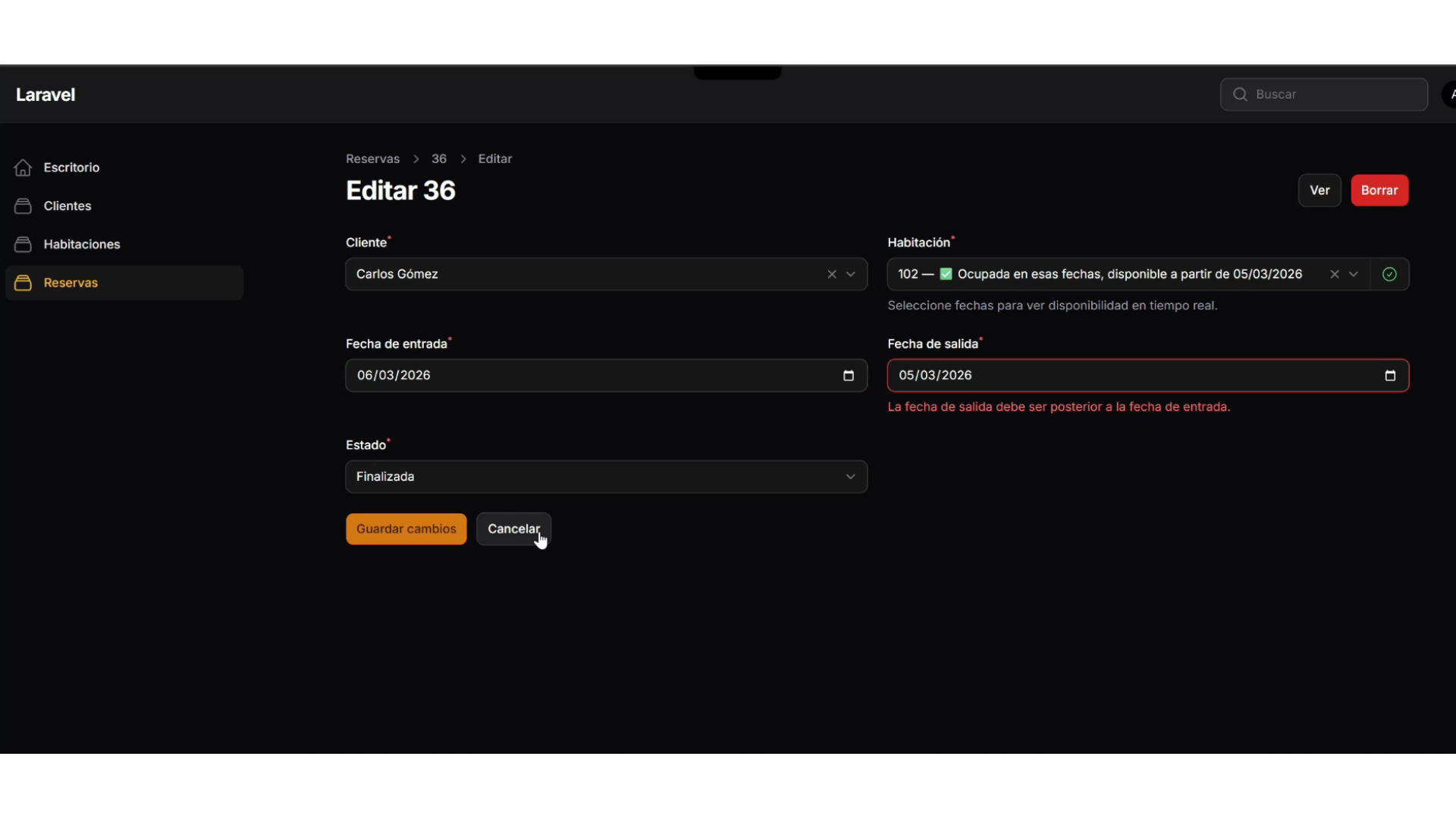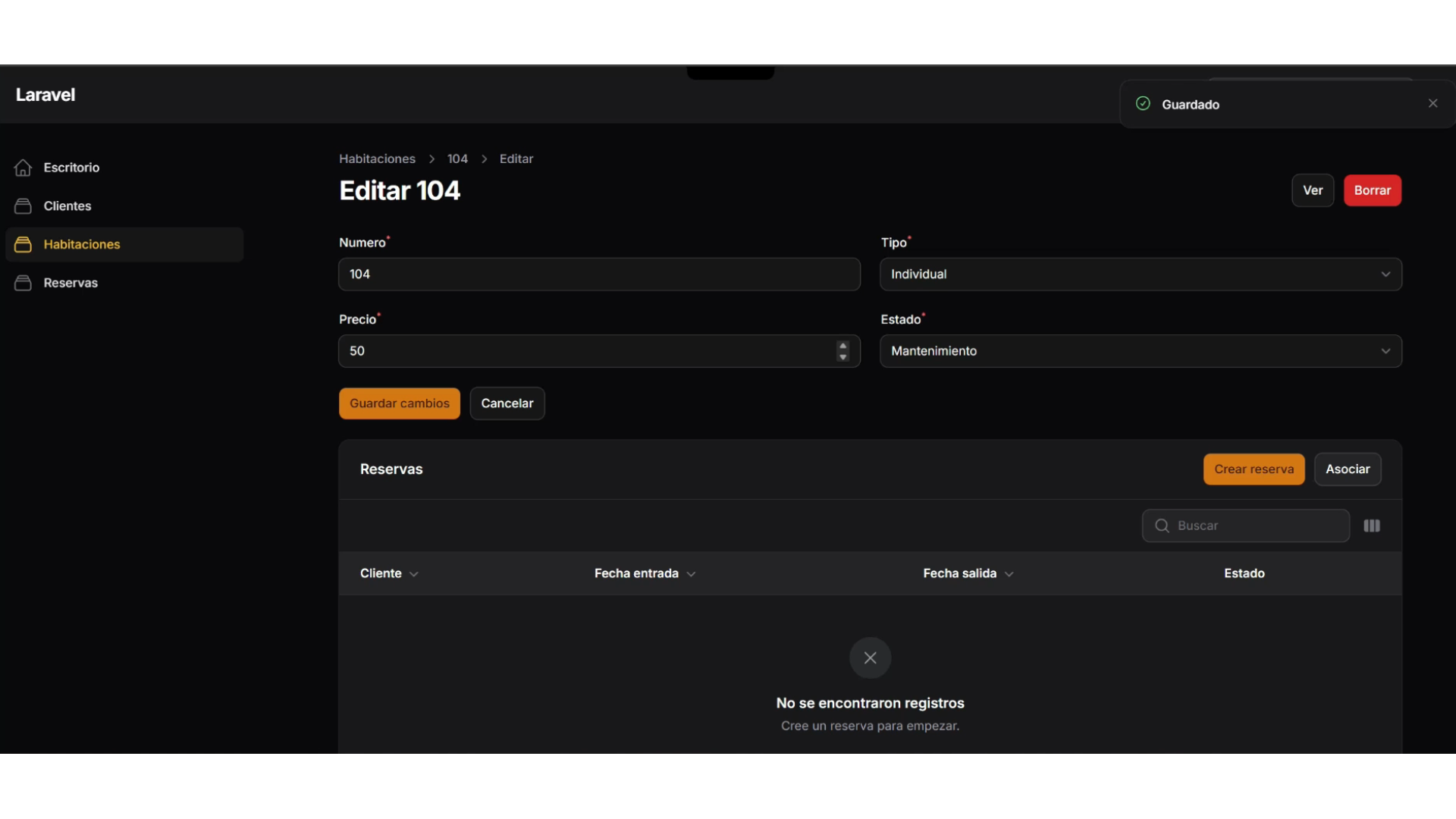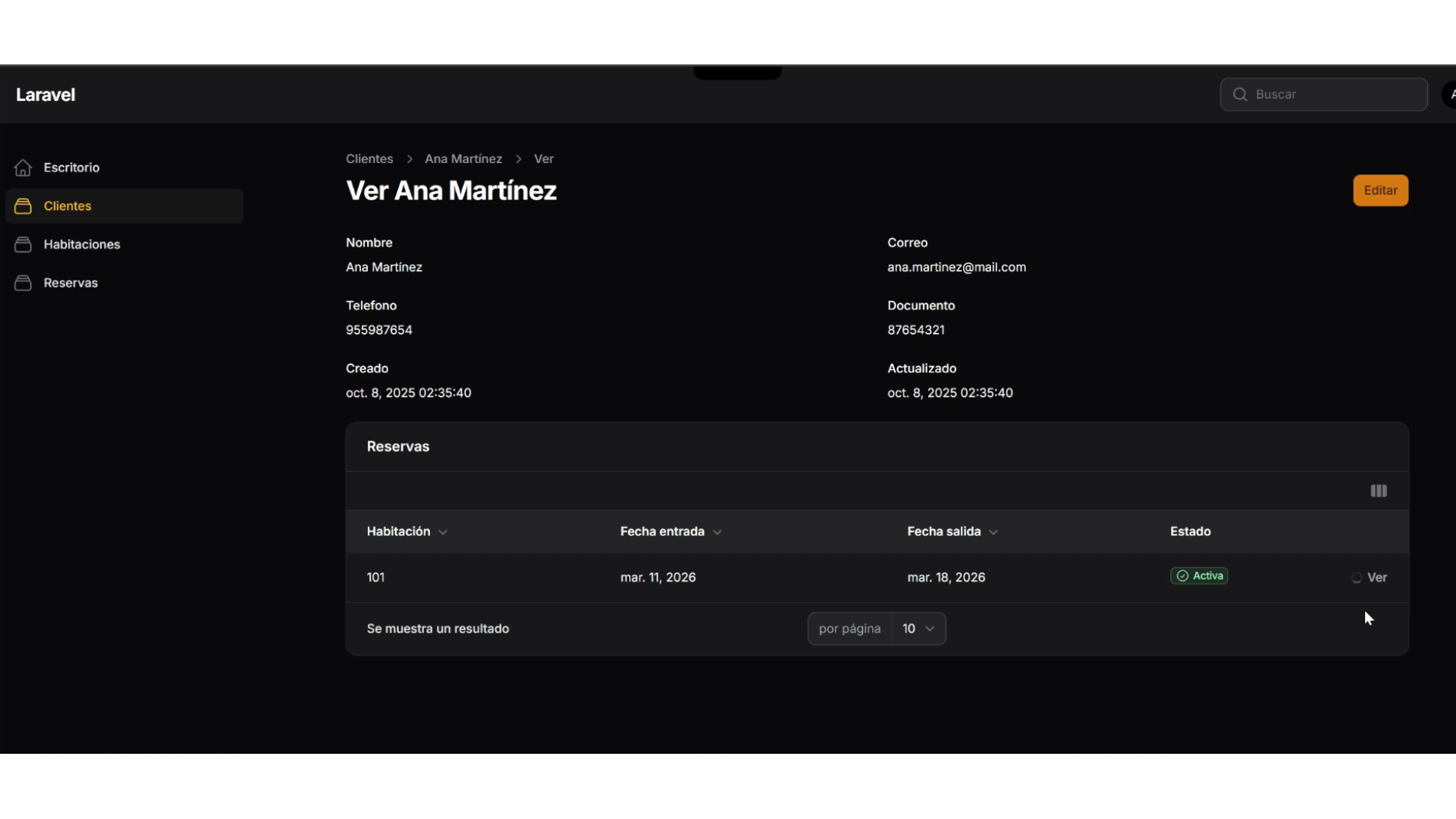 Desarrollé un sistema web de gestión de reservas hoteleras con Laravel y Filament, implementando CRUD de clientes, habitaciones y reservas con tablas relacionadas para asegurar integridad de datos. Incorporé autenticación con Filament y un dashboard con métricas en tiempo real, incluyendo gráfico tipo dona para el estado de reservas, gráfico lineal comparativo mensual y paneles con indicadores clave (clientes, habitaciones disponibles y ocupadas, reservas activas, canceladas y finalizadas). Integré desarrollo full-stack, modelado relacional y visualización de datos en una solución eficiente y escalable orientada a la toma de decisiones.